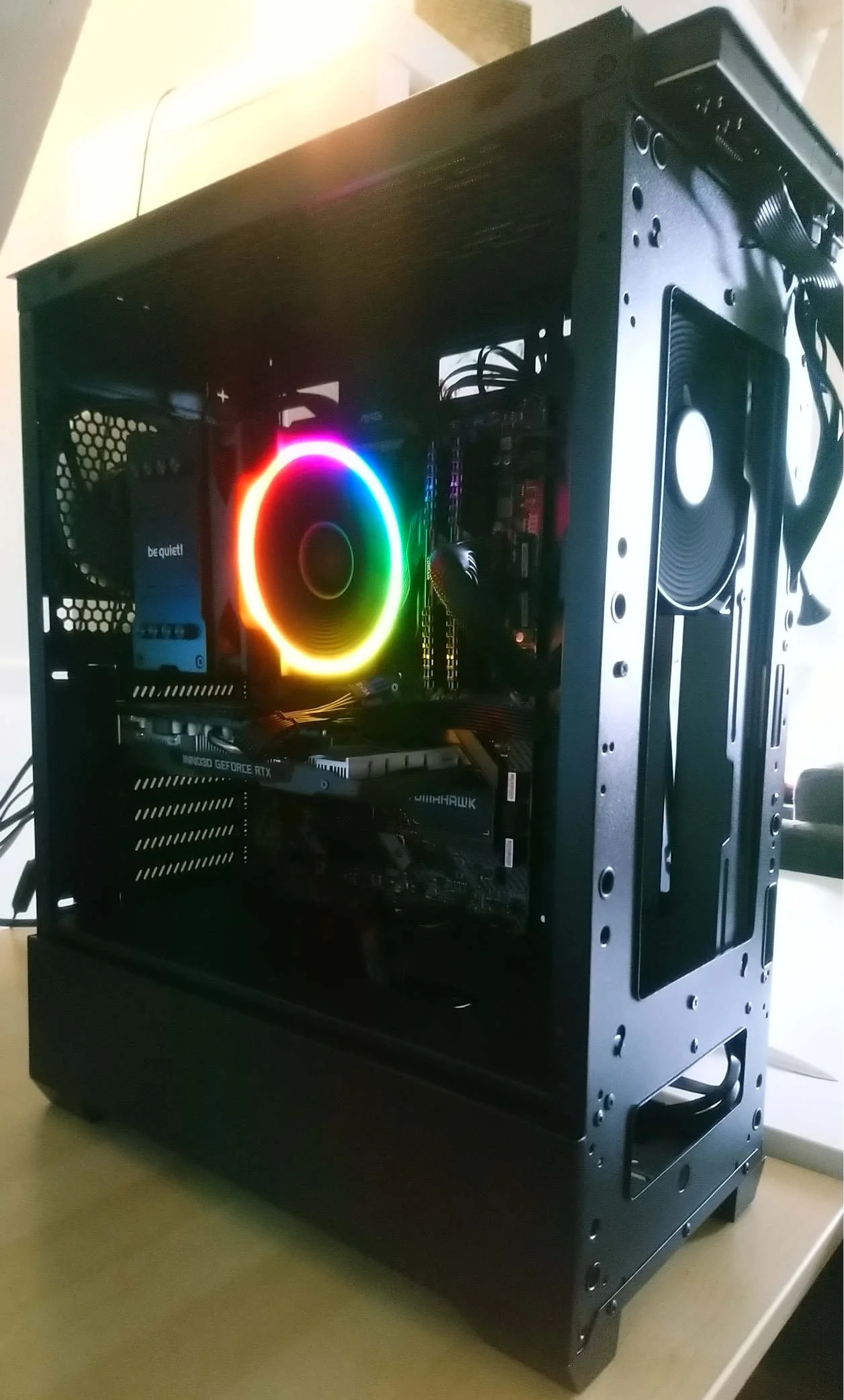 Now that I have the system up and running fine, I made the final addition to the rig. I removed the fans with that came with the case and replaced them with two “be quiet! Light Wings 3 120mm PWM” high-speed fans. I got one of them with RGB lighting to light up the cooler on the CPU.